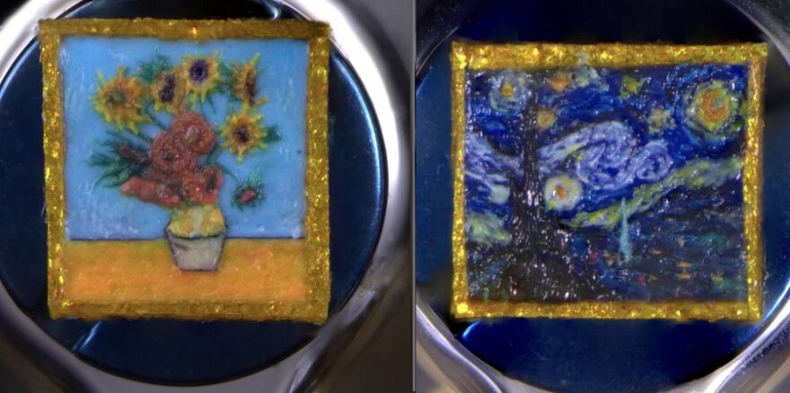 Той използва микроскоп между ударите на сърцето си, за да поддържа ръцете си достатъчно стабилни, и процесът отнема два месеца, за да завърши всяко от изображенията, представляващи Звездна нощ, Слънчогледите и Автопортрет.