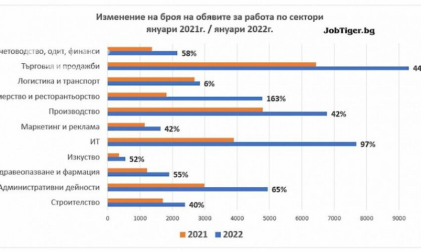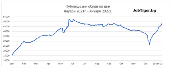 В началото на годината HR компанията и кариерен сайт JobTiger отрази стандартен за периода спад на предложенията за работа. В края на януари наблюдаваме бързо възстановяване на броя на обявите за работа. Той се е увеличи с цели 70%, като спрямо януари 2021г. това увеличение е 55%.