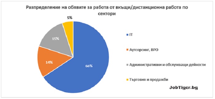 Предложенията за работа от вкъщи и/или дистанционна работа са се увеличили с 51% спрямо декември, като техният дял спрямо общия брой обяви е 14,9%. Отново, подобно на предходните месеци, най-многобройни са те в сектора „ИТ“ (66%), следвани от „Административни и обслужващи дейности“ (15%) и секторите на аутсорсинг (BPO) индустрията (14%) и „Търговия и продажби“ (5%).