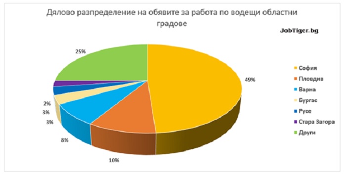 Предложенията в столицата заемат дял от 49% от общия брой, а в останалите градове разпределението е: Пловдив (10%), Варна (8%), Бургас (3%), Русе (3%) и Стара Загора (2%).