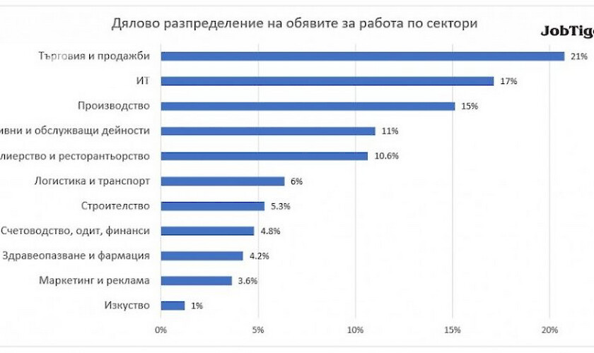 При останалите сектори ръстът на обявите е както следва: „Административни и обслужващи дейности“ (76%), „Здравеопазване и фармация“ (75%), „Хотелиерство и ресторантьорство“ (72%), „Търговия и продажби“ (67%), „Логистика и транспорт“ (21%) и „ИТ“ (20%).