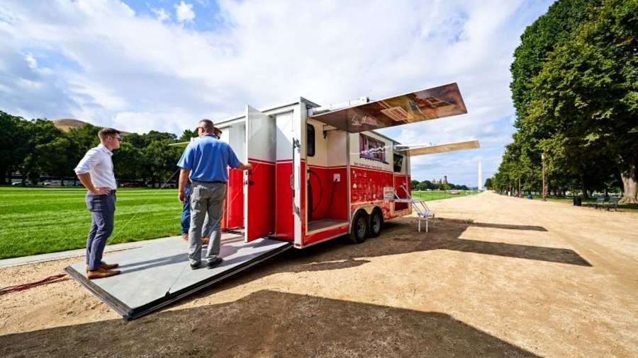 Подобното на ремарке решение може лесно да бъде сбъркано с камион за храна или мобилен офис. Но човек трябва само да натисне бутон и да каже драматично „Сезам, отвори се!“, за да види електронните контроли да разгъват прибиращите се слънчеви стени и да разкрият инженерното чудо, което представлява мобилната нано мрежа.