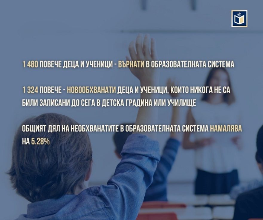 1 480 повече деца и ученици са върнати в образователната система през тази учебна година, с което броят им е нараснал на 10 180. В началото на учебната 2021/2022г. те са били 8 700. 1 324 повече са новообхванатите, които никога не са били записани до сега в детска градина или училище, така общият им брой става 7270, като през миналата година те са били 5946.