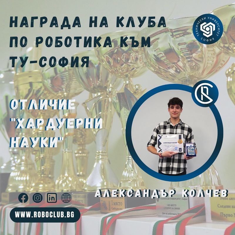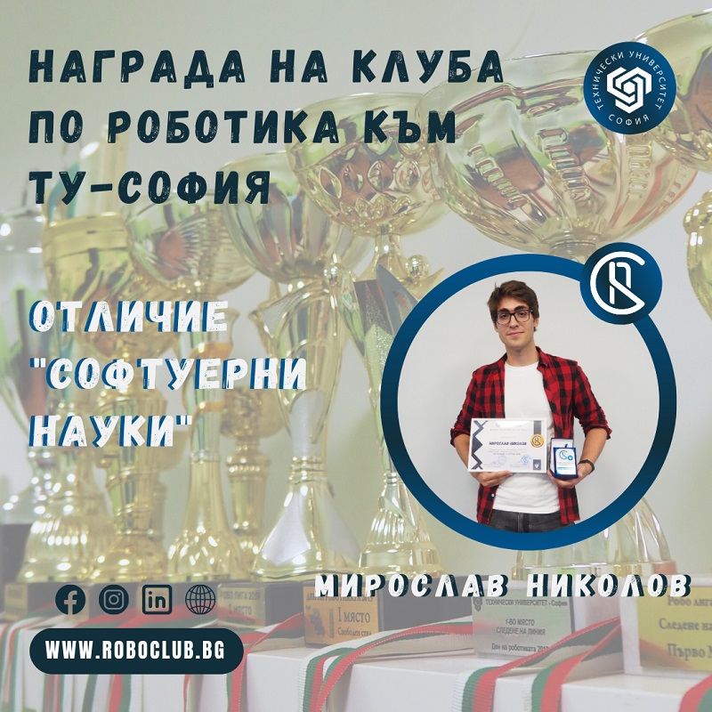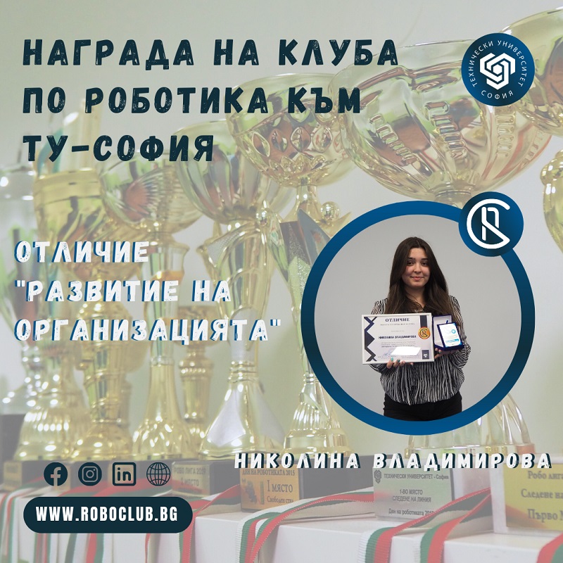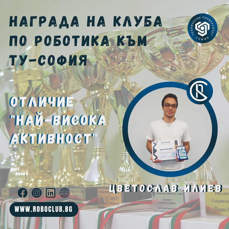 Отличието “НАГРАДА НА КЛУБА ПО РОБОТИКА” към ТУ-София цели да отличи 4-ма души от клуба, с цел отдаване на признание и благодарност за добре свършената работа, отдадеността, старанието и усилената про-/активност през последната 1 година, което да послужи за мотивация в бъдещата ни съвместна работа и пример за останалата част от екипа.