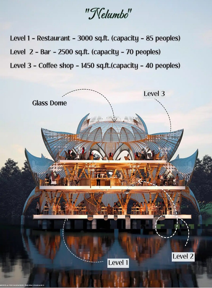 „Nelumbo има за цел да създаде хармонична комбинация от новаторска архитектура, устойчиви материали и разнообразни възможности за хранене, като същевременно предлага на посетителите уникално изживяване, което ги свързва с естествената красота на неговата крайбрежна обстановка“, обяснява Liyanage.