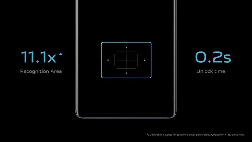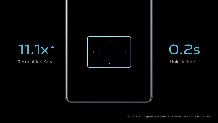 Разположен под дисплея и базиран на ултразвукова технология, сензорът за пръстов отпечатък с повърхност от 20х30 кв.мм, е най-големият в мобилната индустрия. Зоната разчитане е 11.1 пъти по-голяма от традиционните оптични сензори за пръстови отпечатъци в дисплея, което подобрява цялостното преживяване при отключване.