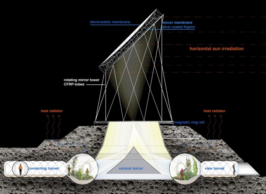 PneumoCell казва, че тяхното местообитание използва нова огледална технология, която отразява видимата слънчева светлина в оптимален диапазон на дължината на вълната в оранжерия, без да отразява вредното лъчение. Това позволява на оранжерията да действа като естествен източник на храна и жизнено пространство за екипажа, осигурявайки им малка част от дома на Луната.
