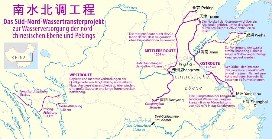 Китай проютява 20% от световното население, но само една шеста от неговите водни ресурси. Признавайки несъответствието между сухите условия в индустриално и земеделско значимите северни региони и наводненията на юг, концепцията за преразпределение на водата е предложена за първи път от Мао Цзедун през 1952 г.