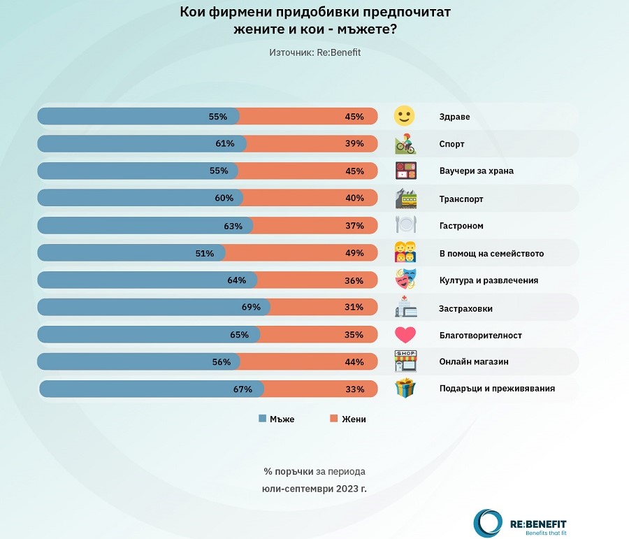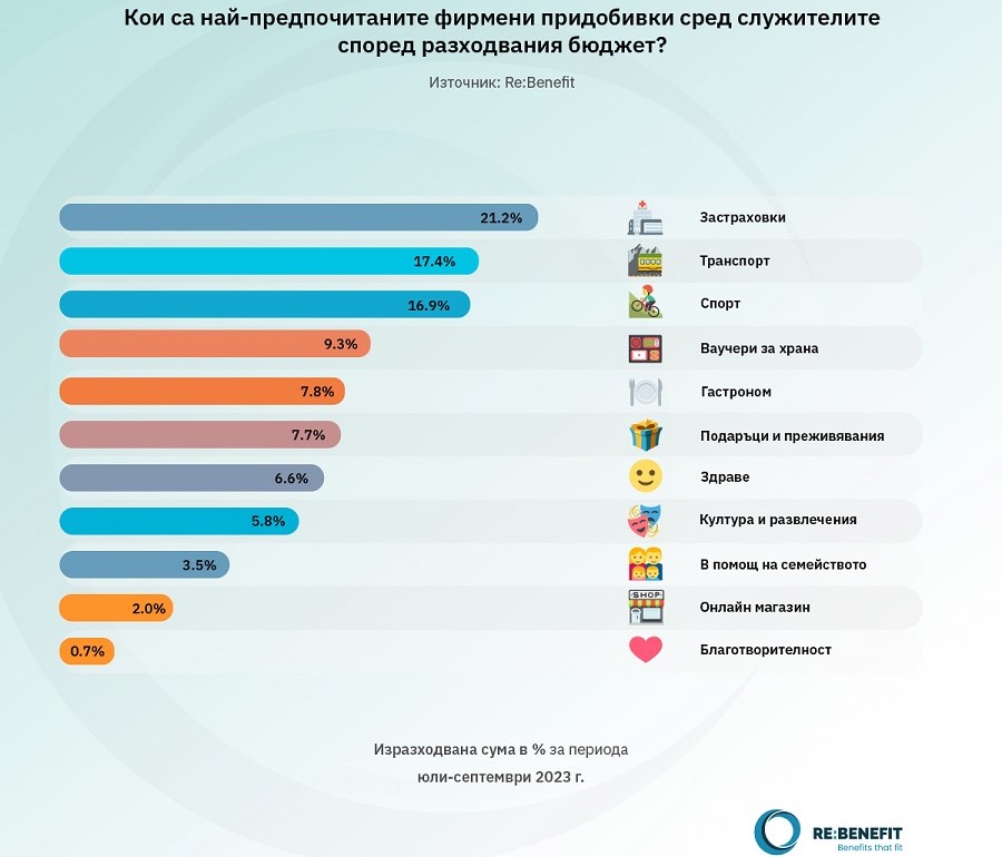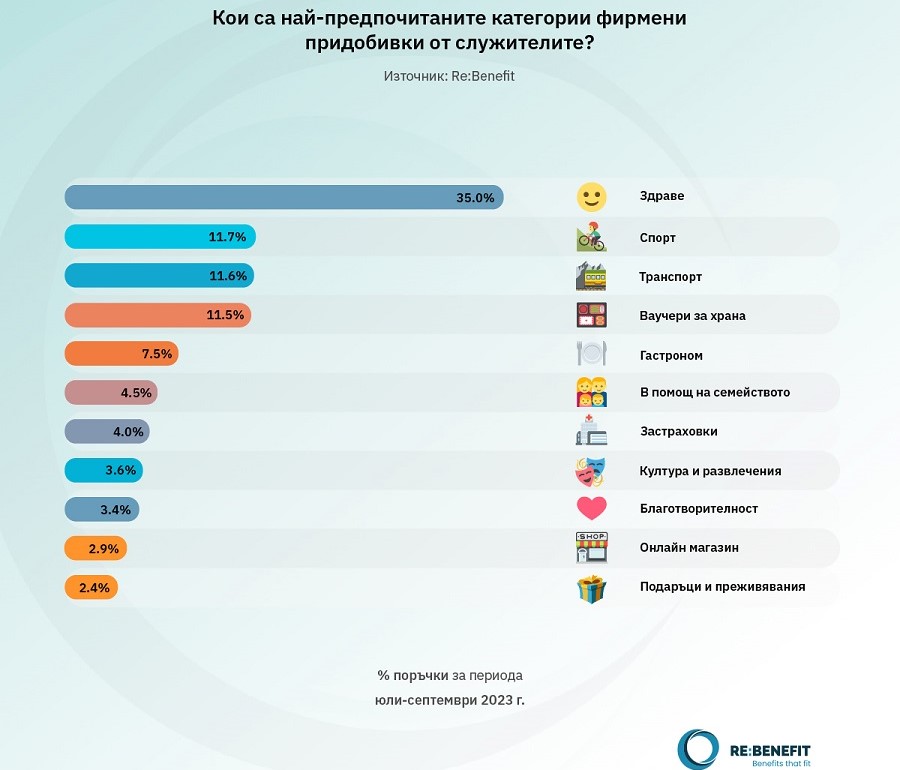 Най-предпочитана категория фирмена придобивка от страна на служителите за периода юли-септември 2023 г. остава “Здраве”, като тя заема 35% от общия избор (всички поръчки), направен от служителите. С 11% се нарежда, като втори избор за служителите, категория “Спорт”. Изборът на тези две категории показва приоритета в желанието на служителите да се грижат за общото си състояние, което включва физическо и психическо здраве. Непосредствено след тях се нареждат категориите “Транспорт” и “Ваучери за храна”. Тази тенденция се запазва спрямо второто тримесечие на годината, когато “Транспорт” изпреварва с малко категорията “Ваучери за храна”.