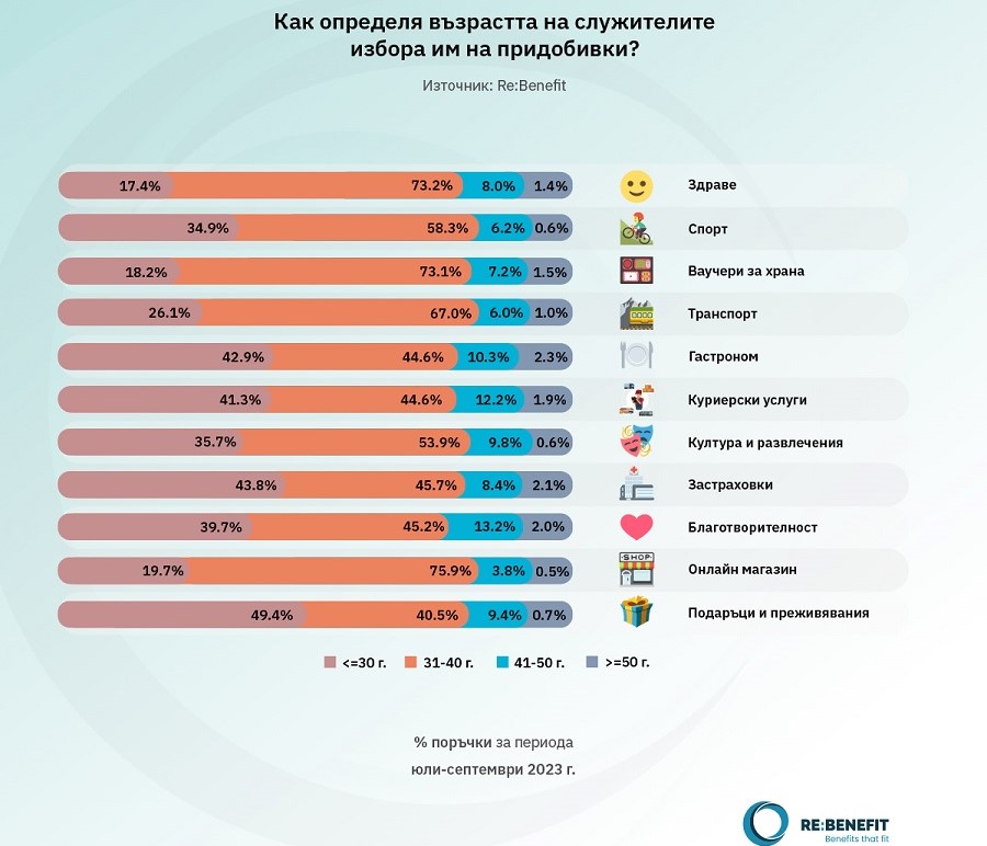 “Добър ориентир за работодателите в изграждане на правилната стратегия по отношение на политиката им за служителски придобивки би трябвало да е факторът възраст”, коментират от Re:benefit. Свободата, която дава платформата в избора на допълнителни възнаграждения, покрива специфичните нужди за всяка една възрастова група, защото изборът е сред над 120 различни продукти и услуги.