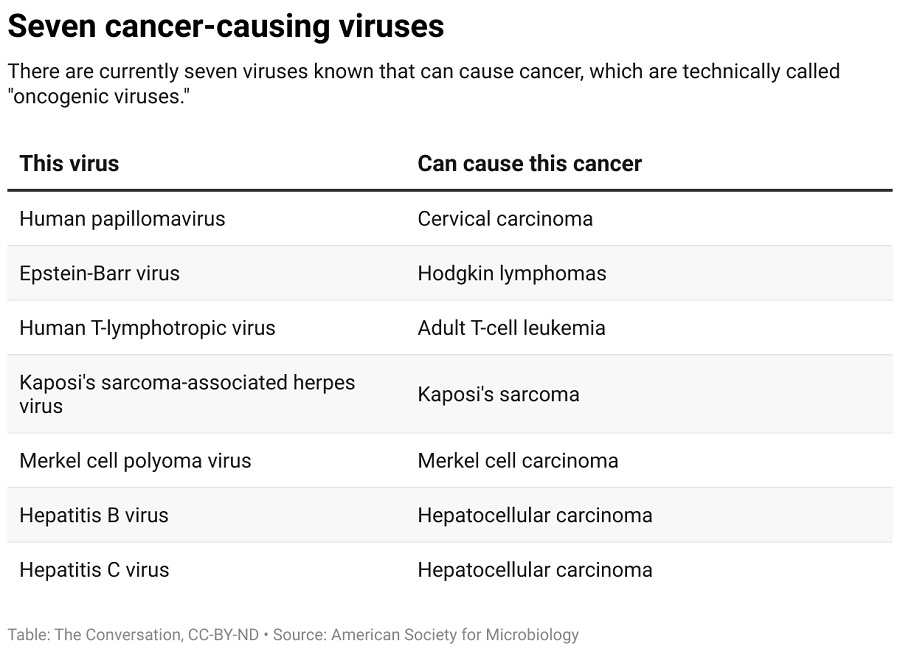 Има седем известни вируса, които могат да причинят рак. Пет от тях са членове на устойчиви вирусни семейства. Човешкият папиломен вирус, известен като HPV и за който е известно, че причинява рак на шийката на матката, е от семейството на папиломавирусите (ДНК вируси, без обвивка). Вирусът на Epstein-Barr, който причинява лимфома на Ходжкин, и вирусът, свързан със саркома на Капоши, са от семейството на херпесвирусите. Човешкият Т-лимфотропен вирус, който може да причини вид левкемия, е от семейството на ретровирусите (РНК вируси, които вкарват копие от своя РНК геном в ДНК на клетката приемник, като променят генома на клетката). А клетъчният полиомавирус на Меркел, който причинява рак на кожата (Меркел–клетъчния карцином), е от семейството на полиомите.