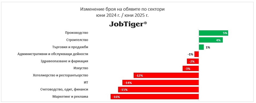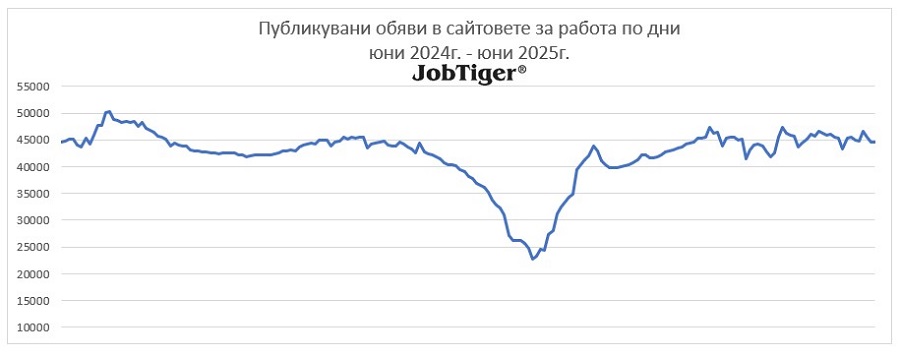 Според месечният анализ на HR компанията и кариерен сайт JobTiger обявите през месец юни са намалели с 2% или около 700 по-малко спрямо предходния месец май. Общият брой на предложенията е около 44000, като на годишна база също се отчита спад от 5% или 2500 предложения по-малко. Вече пети месец наблюдаваме тенденция на спад на предложенията спрямо предходната година.