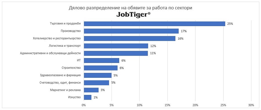 Разпределението на обявите през май е, както следва: Секторът „Търговия и продажби“ заема над 25% от общото предлагане в страната. След него се нареждат секторите „Производство“ (17%), „Хотелиерство и ресторантьорство“ (16%), „Логистика и транспорт“ (12%), „Административни и обслужващи дейности“ (11%), „ИТ“ (6,4%), „Строителство“ (6,1%), „Здравеопазване и фармация“ (5%), „Счетоводство, одит, финанси“ (4,6%), „Маркетинг и реклама“ (3%) и „Изкуство“ (1%).