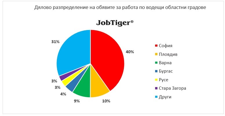 Като дялово разпределение в София обявите продължават да съставляват 40%, а в останалите градове съотношението е следното: Пловдив (10%), Варна (9%), Бургас (4%), Русе (3%) и Стара Загора (3%).