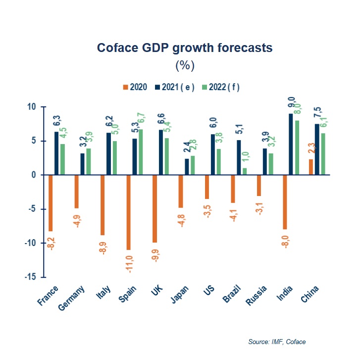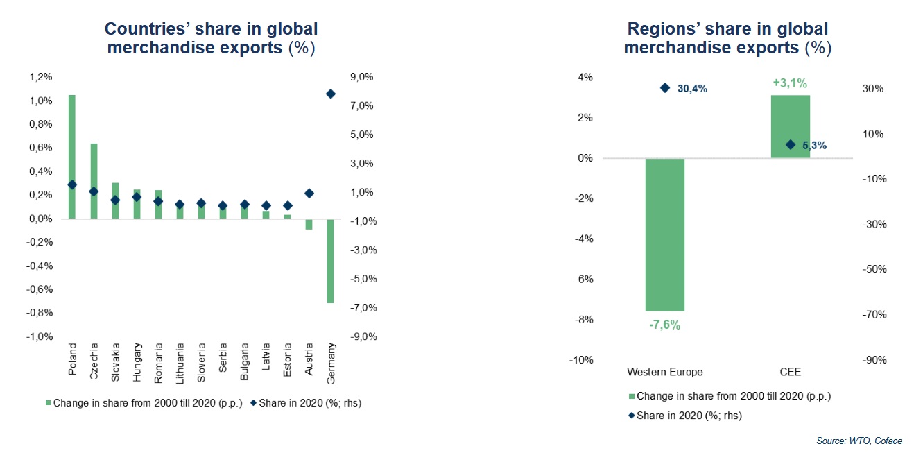 Експертите отчитат увеличение на дяловете на икономиките на страните от ЦИЕ на глобалния пазар. Така през 2021 г. делът на страните от ЦИЕ в световен мащаб по отношение на износа на стоки се увеличава общо с 3,1%, а тези от Западна Европа бележат спад от 7,6%. Първенци тук са Полша, Чехия и Словакия. Голям спад се наблюдава в Германия – с близо 7%. Страната е изправена пред сериозни затруднения. Така делът на компаниите, според които недостигът на компоненти за производството e основният проблем, пред който се изправят през последното тримесечие на 2021 г., е най-висок в сектора на електрониката – 90%, последван от автомобилната индустрия – 88% и машинната индустрия – 81%. За същите затруднения алармират компании от почти всички останали индустрии – тези, които работят в мебелното производство, металите, хартията и опаковките, текстилът и дори стъклото.