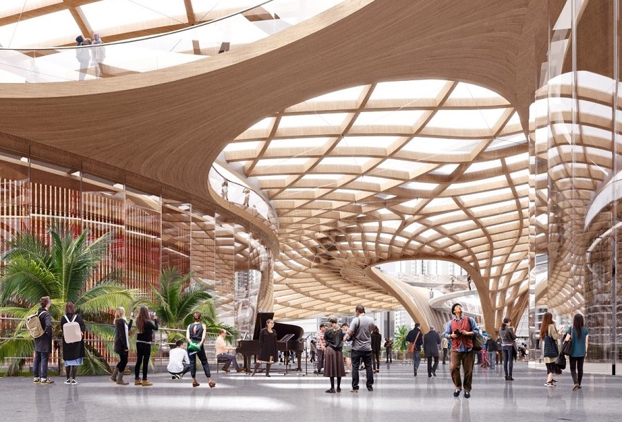 Търговските площи ще бъдат разпръснати из културните пространства, с разположение покрай езерото. Платформите за наблюдение и вътрешните дворове на втория етаж спомагат за свързването на културните пространства, както и предоставят допълнителни възможности за наслада на открито.