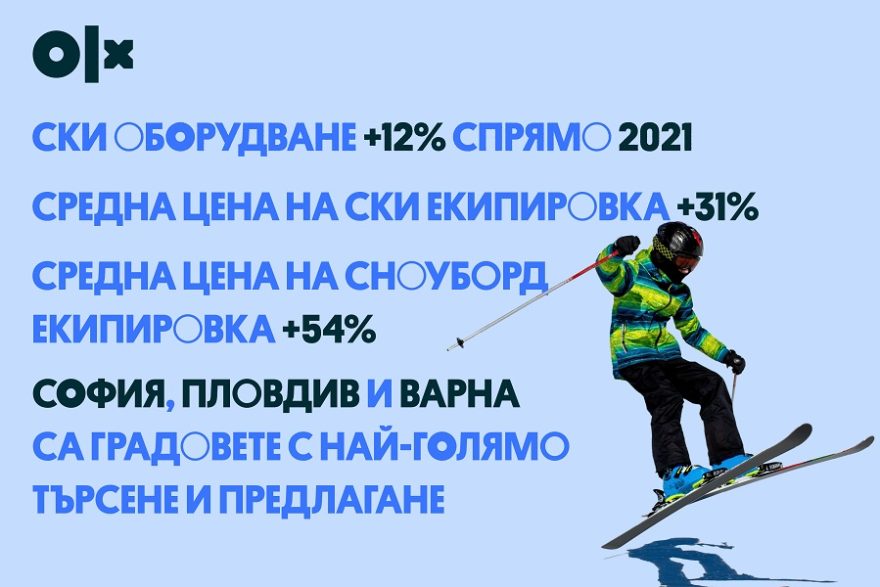 Най-голямата платформа за онлайн търговия OLX отчете близо 12% увеличение в търсенето на ски оборудване в периода януари-октомври тази година, спрямо предходната 2021 г. То представлява 66% от 20-те най-популярни запитвания в сайта, докато делът на облеклото за сноуборд е 19%.