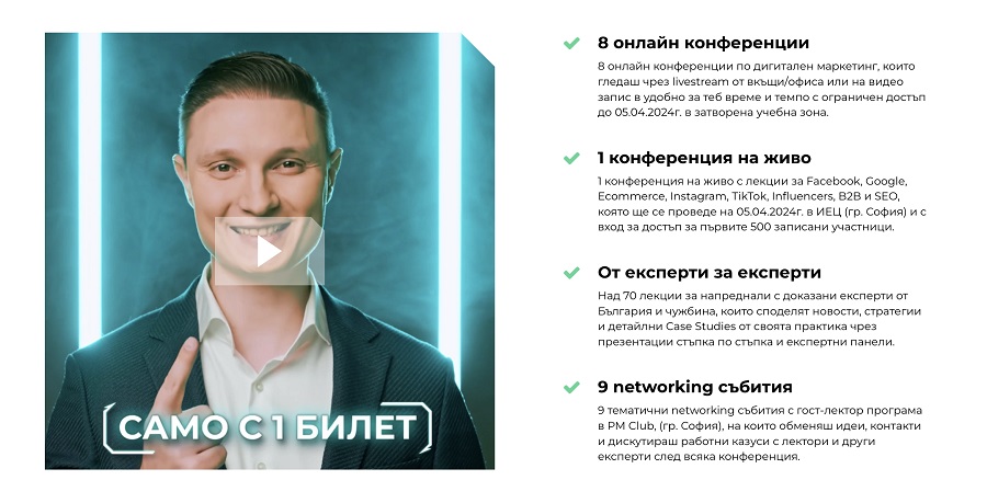 Надграждайки проекта от 1 на 9 конференции (8 онлайн и 1 на живо в зала), заедно с едни от най-добрите агенции и гост лектори експерти в бранша, F5 Conf ще предложи уникален модел за участие с 1 билет, който дава достъп до всички 9 конференции в сферите на Facebook, Instagram, TikTok, Google, SEO, E-commerce, B2B и Influencer marketing. Билетът включва 1-годишен достъп до затворена учебна зона с видео записи от всяко събитие за последващо гледане и прилагане.