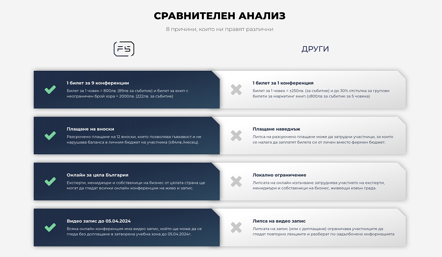 „Нашата конференция не е единствена на българския пазар. Но нашите участници, които са посещавали други маркетинг събития, споделят, че F5 Conf няма аналог от гледна точка на практичност и дълбочина на съдържанието. Причината за това е, че едни от най-добрите маркетинг експерти в България повярваха в нашата мисия и вече 6 поредни години дават всичко от себе си за нашите участници“.