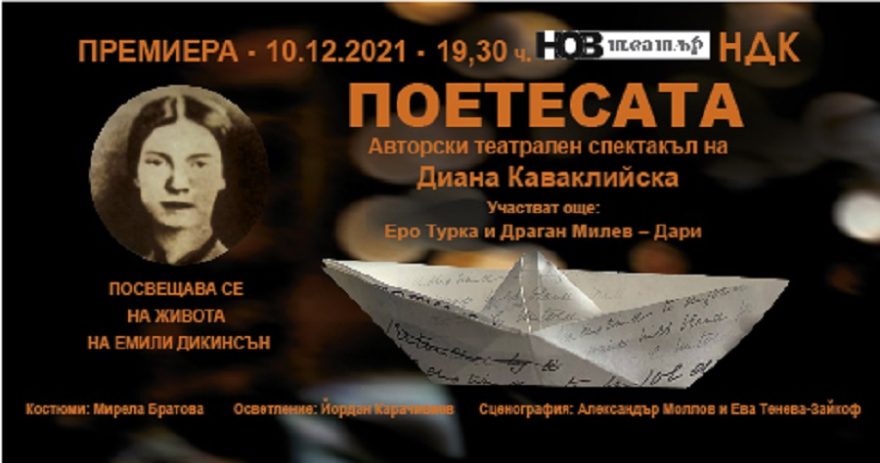 „Нов театър“ НДК Ви кани на 10.12.2021 г. от 19.30 часа на авторския театрален спектакъл на Диана Каваклийска, „Поетесата“, посветен на живота на мистериозната американска поетеса Емили Дикинсън.