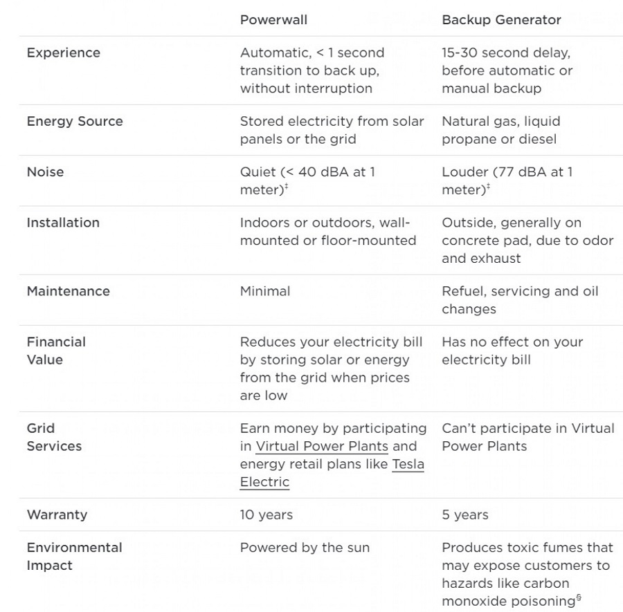 „Когато е свързан със слънчева енергия, Powerwall работи ежедневно, за да намали месечната ви сметка за електричество. В продължение на десет години тези спестявания могат да направят Powerwall и слънчевата енергия по-рентабилни от генератора.“