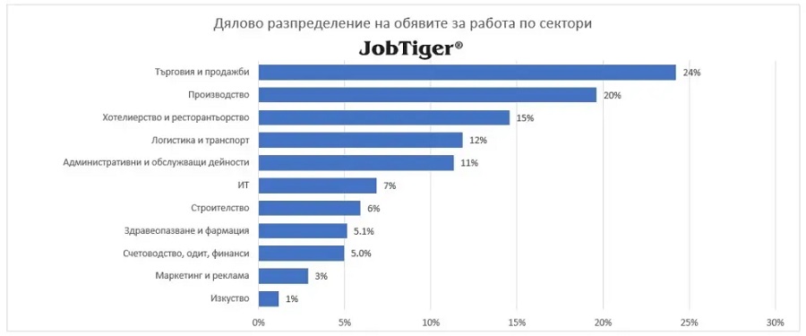 С най-голям дял продължават да бъдат обявите в сектор „Търговия и продажби“ (24%). Сектор „Производство“ измества „Хотелиерство и ресторантьорство“ от второто място и обявите в него съставляват 20% от общия брой обяви за работа. Съответно сектор „Хотелиерство и ресторантьорство“ заема трето място с дял от 15%.