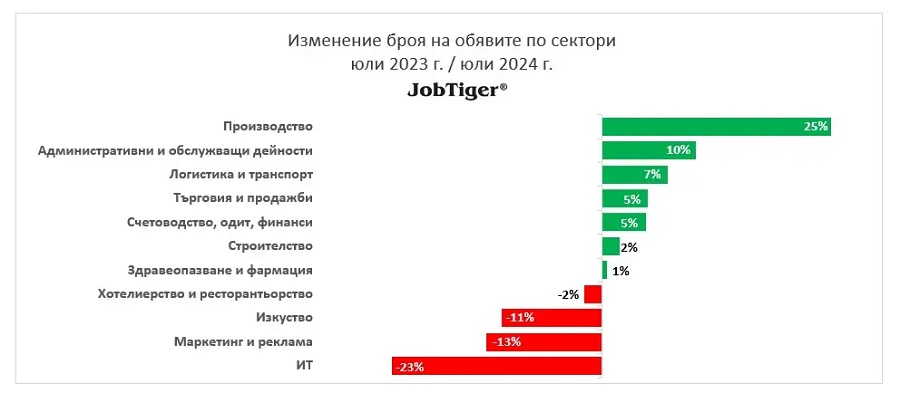 Според анализът на HR компанията и кариерен сайт JobTiger с най-голям ръст на годишна база са обявите в сектор „Производство“ (25% ръст), а с най-голям спад продължава да бъде сектор „ИТ“, с 23% по-малък брой предложения. Динамиката при останалите сектори е илюстрирана на схемата по-долу.