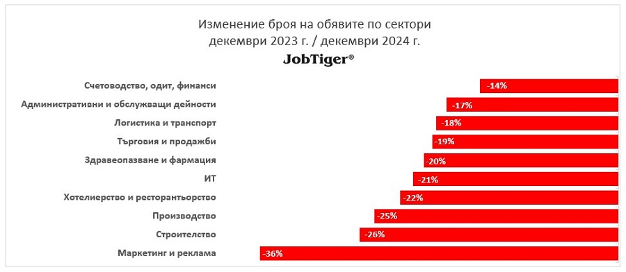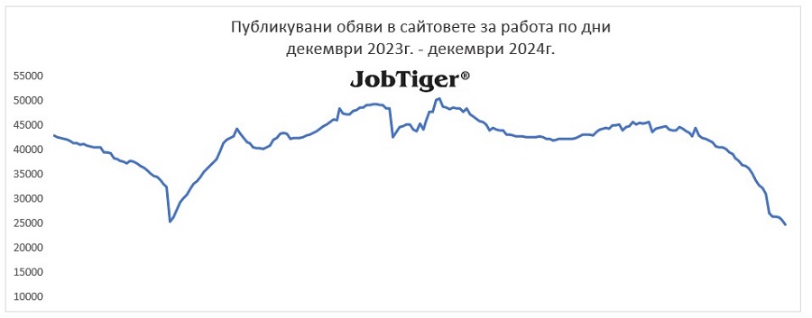 В последния месец на 2024 г. обявите за работа са намалели с 39% спрямо предходния месец. Според месечният анализ на HR компанията и кариерен сайт JobTiger спадът възлиза на близо 15 000 предложения по-малко на месечна база, като общият брой на обявите в края на м. декември е около 23 200.