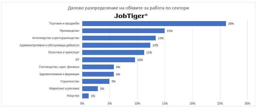 Най-голям спад се отчита в сектор „Търговия и продажби“ (3 560 предложения по-малко, 37% спад), следван от „Производство“ (2 760 предложения по-малко, 44% спад) и „Хотелиерство и ресторантьорство“ (1 770 предложения по-малко, 36% спад). Следват секторите „Логистика и транспорт“ (1 650 предложения по-малко, 39% спад), „Административни и обслужващи дейности“ (1 580 предложения по-малко, 36% спад), „Строителство“ (1 050 предложения по-малко, 48% спад), „ИТ“ (900 предложения по-малко, 29% спад), „Здравеопазване и фармация“ (850 предложения по-малко, 39% спад), „Счетоводство, одит, финанси“ (660 предложения по-малко, 33% спад) и „Маркетинг и реклама“ (400 предложения по-малко, 38% спад).