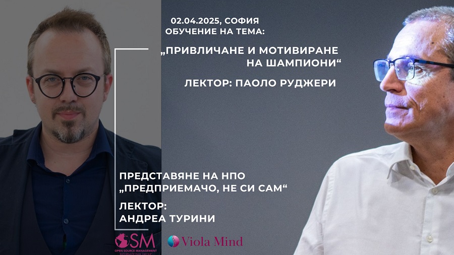 Събитието, обучение с кауза, се организира от Viola Mind, франчайз партньор на Open Source Management International Group. Предназначено е за предприемачи и мениджъри на екипи, а темата е „Привличане и мотивиране на шампиони“. Всеки участник ще получи безплатно I-Profile analysis test – инструмент за оценка на личните и професионалните силни страни и зони за подобрение, и за стратегическо планиране на ресурсите в компанията в посока растеж.
