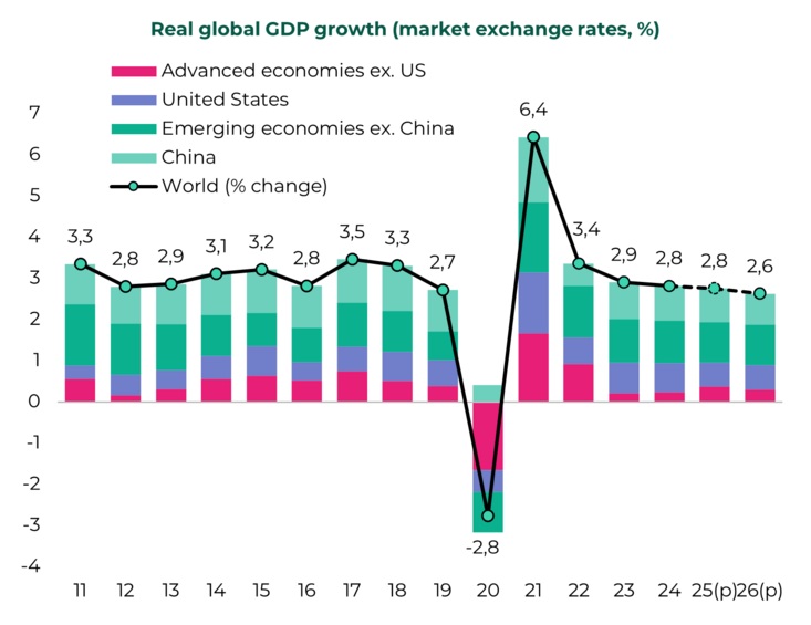 - +2,6%: прогнозиран глобален растеж през 2026 г.