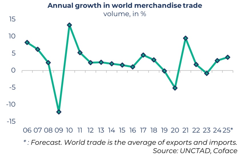 2025 година оправда очакванията, като историческите събития се развиха с ускорено темпо, движени едновременно от сътресения и стабилизиращ се глобален растеж, което беше в съответствие с първоначална прогноза на Coface за растеж от +2,8%.