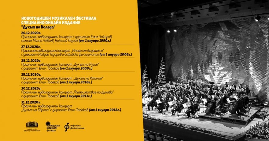 Междувременно любителите на класическата музика ще могат да се насладят на специалното онлайн издание на Новогодишния музикален фестивал „Духът на Коледа“. Под този надслов от 26 до 31 декември 2020 г. на страницата на НДК във Фейсбук ще гледаме емблематични Празнични новогодишни концерти през годините /1986 г. – 2020 г./, дирижирани от бележити български диригенти като Емил Чакъров, Найден Тодоров и Емил Табаков. Концертите са предоставени от архива на БНТ и ще бъдат излъчвани в шестте поредни вечери от 18:30 часа.