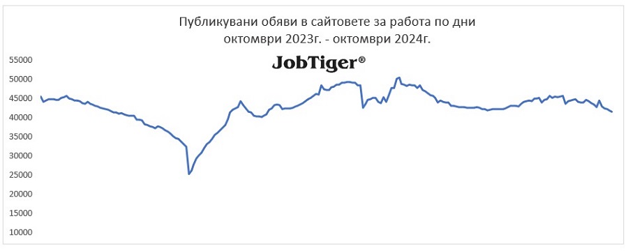 През октомври обявите за работа са намалели с 6% спрямо предходния месец септември. Предложенията са с близо 3000 по-малко, като в края на месеца се наблюдават малко над 41 000 обяви в страната – това показва месечният анализ на HR компанията и кариерен сайт JobTiger.