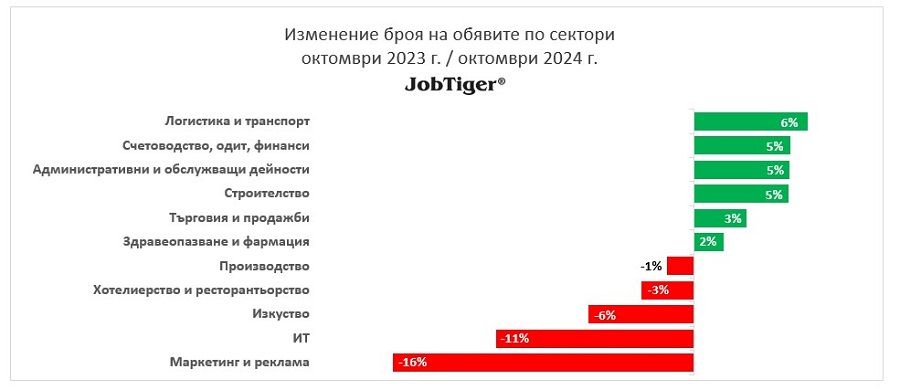 Според анализът на HR компанията и кариерен сайт JobTiger за първи път от повече от година сектор „ИТ“ не е с най-голям спад на предложенията спрямо същия период през предходната година. Спадът в този сектор намалява, като през октомври се наблюдават 11% по-малко предложения спрямо същия месец през 2023 г. С най-голям спад на годишна база са предложенията в сектор „Маркетинг и реклама“ (-16%). Динамиката в останалите сектори е илюстрирана на схемата по-долу.