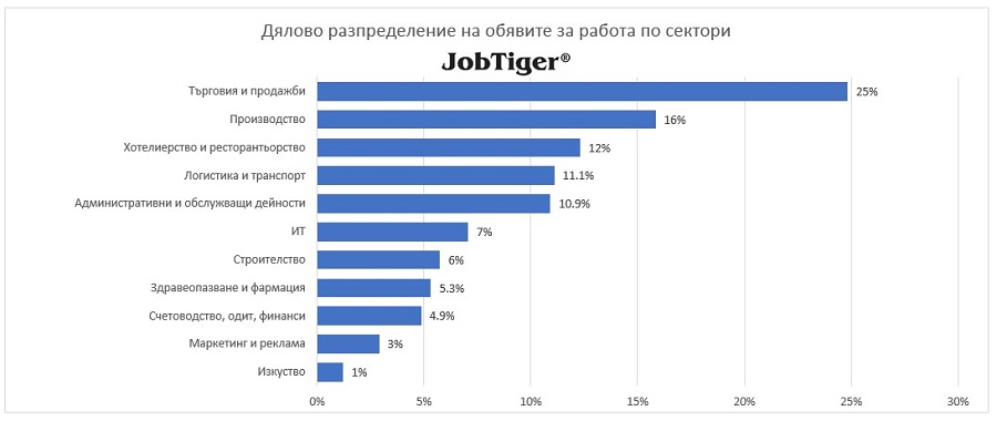 Сектор „Търговия и продажби“ продължава да заема една четвърт от предложенията за работа в страната. След него, без промяна в реда спрямо предходния месец, са секторите „Производство“ (16%), „Хотелиерство и ресторантьорство“ (12%), „Логистика и транспорт“ (11.1%), „Административни и обслужващи дейности“ (10.9%), „ИТ“ (7%), „Строителство“ (6%), „Здравеопазване и фармация“ (5.3%), „Счетоводство, одит, финанси“ (4.9%), „Маркетинг и реклама“ (3%) и „Изкуство“ (1%).