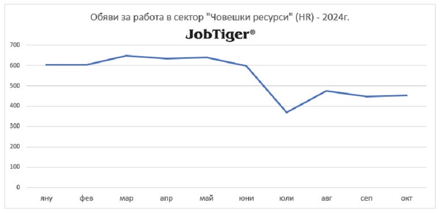 - Наблюдава се тенденция на спад на обявите в сектор „Човешки ресурси“