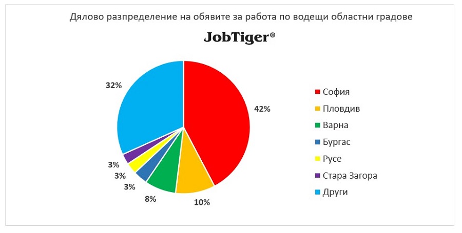 Като дялово разпределение обявите в София са 42%, а в останалите градове: Пловдив (10%), Варна (8%), Бургас (3%), Русе (3%) и Стара Загора (3%). Обявите в останалата част от страната вече съставляват една трета от предложенията. Това не трябва да се тълкува като ръст на обявите извън водещите градове – напротив, техният брой остава по-скоро непроменен, но поради намаления брой предложения в основните градове, делът на обявите в останалата част от страната нараства.