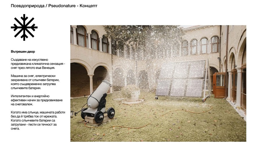 „Псевдоприрода“ развива абсурдна хипотеза, при която през лятото във Венеция вали сняг. Журито посочва, че проектът се занимава с много сериозната тема за климатичните промени и човешката намеса в сложните природни процеси.