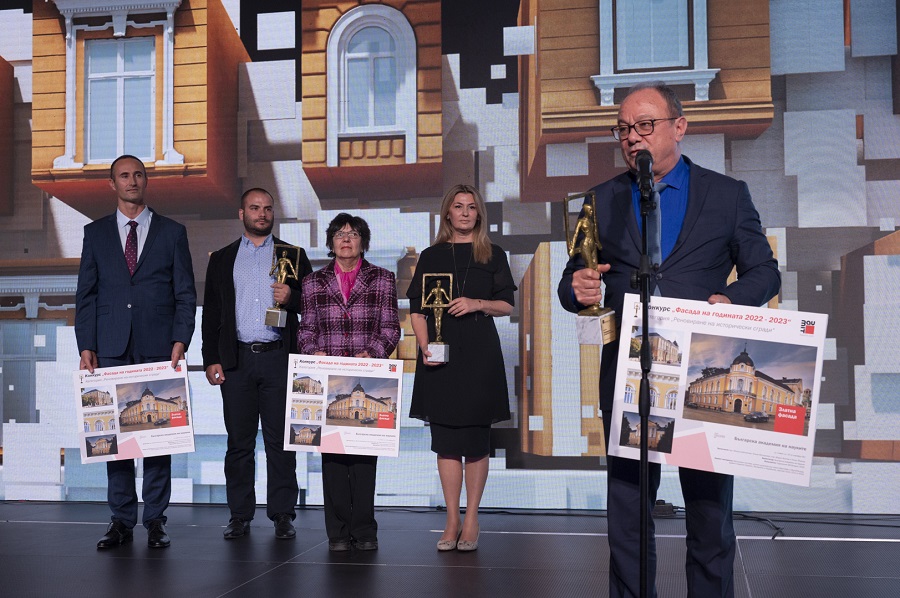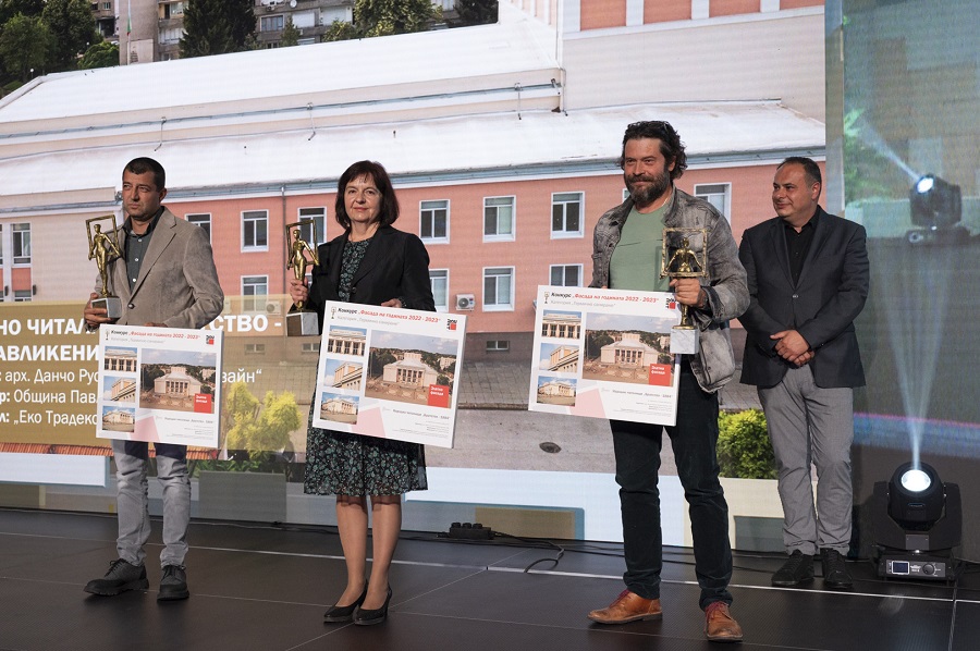 Статуетката „Златна фасада“ и почетна грамота в категория „Термично саниране“ проф. д-р арх. Орлин Давчев връчи на проектанта: арх. Данчо Русчев от „Гравити Дизайн“ ООД, г-жа Анастасия Вачева – заместник-кмет на Община Павликени и г-н Иван Минев от фирма „Еко Традекс Груп“ АД – изпълнител на обекта, които санираха Народно читалище “Братство – 1884“ в гр. Павликени.