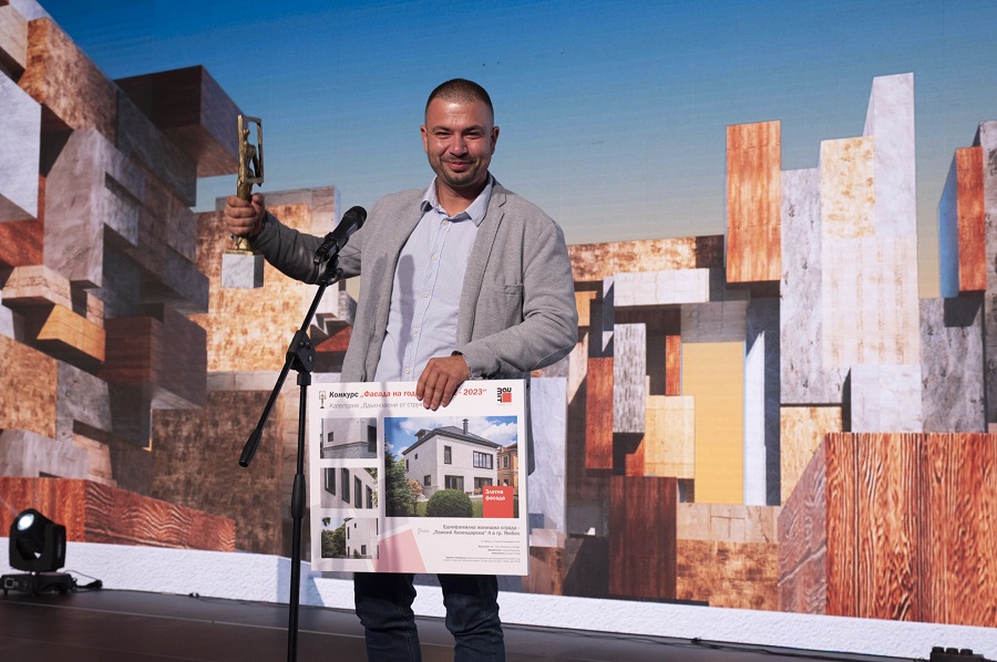 Еднофамилна жилищна сграда на ул. Паисий Хилендарски 4 в гр. Ямбол е първенецът във категория „Вдъхновени от структурата“. На сцената излезе г-н Радостин Паунов – управителят на фирмата изпълнител „Силма 60“ ООД, за да получи статуетката „Златна фасада“ и почетна грамота.