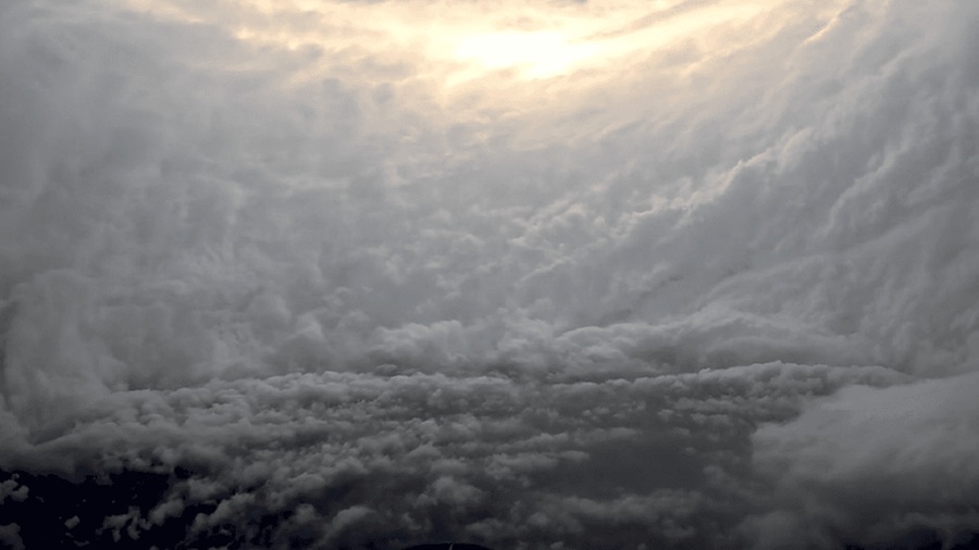 Самолетът навлиза в окото на бурята от югоизток малко след изгрев слънце, преминавайки през гъсти сиви облаци с ограничена видимост. Видеото показва как слънчевата светлина пробива, докато кръглата стена на окото става видима, с облаци, които се въртят бързо около спокойния център.