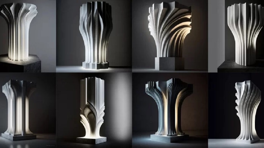 На архитектурен панаир във Венеция, Фу използва Midjourney, за да създаде серия от чисто нови изключителни колони и се обединява с известния резбар на камък, Тил Апфел, за да им вдъхне живот.