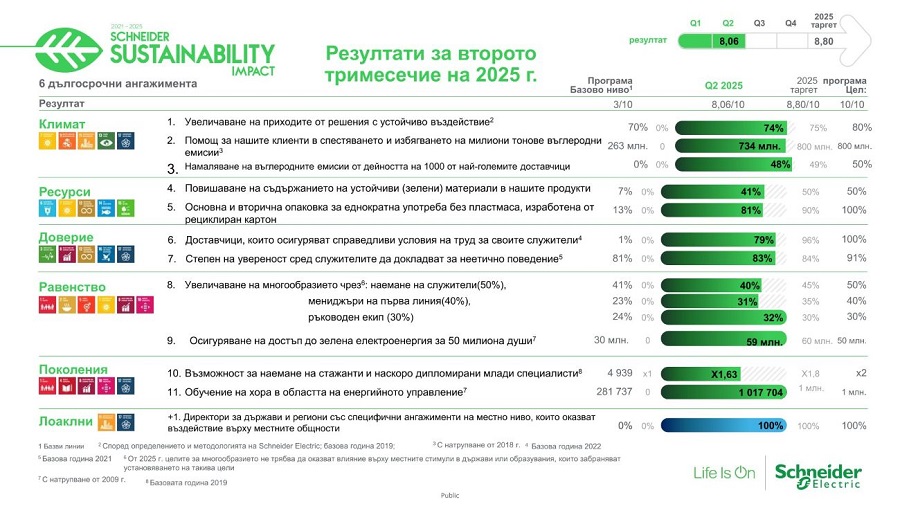 Пълните резултати и индикатори за напредък са публикувани в доклада Schneider Sustainability Impact за Q2 2025.