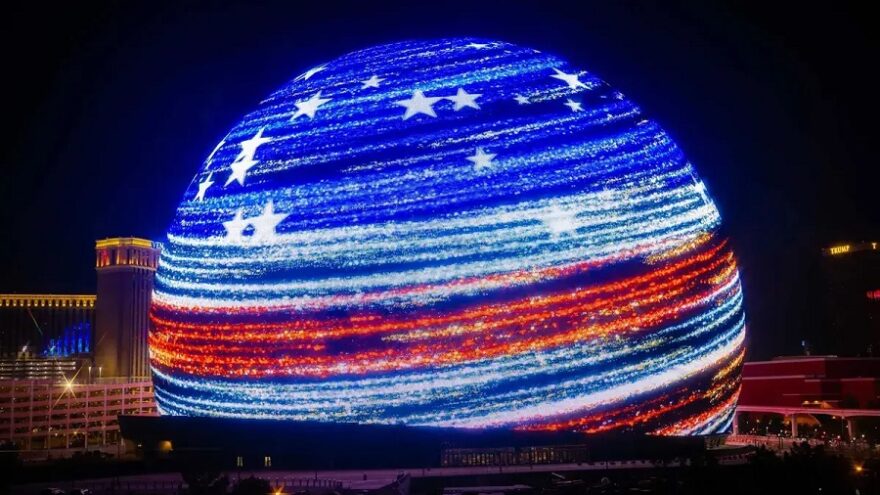 Най-новото допълнение към силуета на Лас Вегас, така наречената „Сфера“, светна и тества своя гигантски външен екран за първи път този четвърти юли.