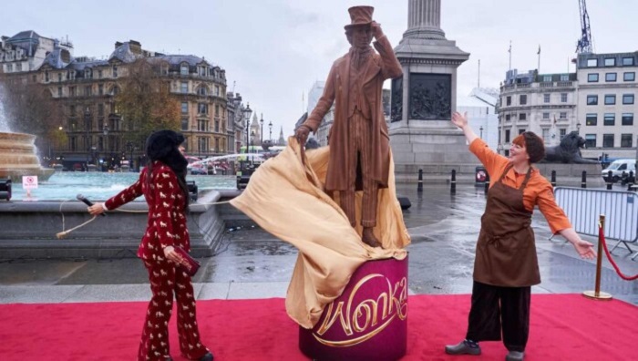 Скулптура с височина 1,90 м., вдъхновена от едноименния герой в новия филм за ексцентричния шоколатиер „Уонка“, е открита тази седмица на площад Трафалгар в Лондон.