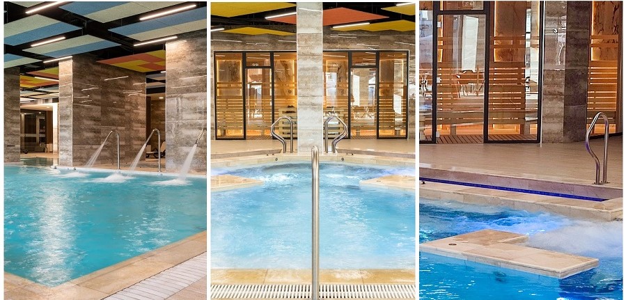 Във вътрешната СПА зона има голям основен басейн, джакузи, акватоничен и контрастен басейни, приключенски душ, детски басейн, парна баня, хамам, 2 сауни, едната от които билкова, солна стая, инфраред сауна, релакс зона, СПА бар и зона за храни и напитки.