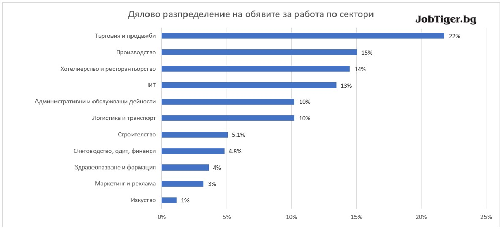 Водещ с най-голям дял на предложенията продължава да бъде сектора „Търговия и продажби“ с 22%.