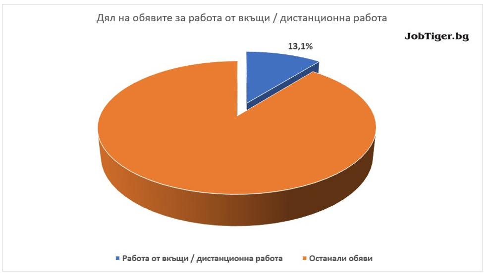 Броят на предложенията за работа от вкъщи и/или дистанционна работа са намалели със 7% (300 предложения по-малко) спрямо м. юни. Те са малко над 5200 за страната или 13,1% от общия брой обяви.