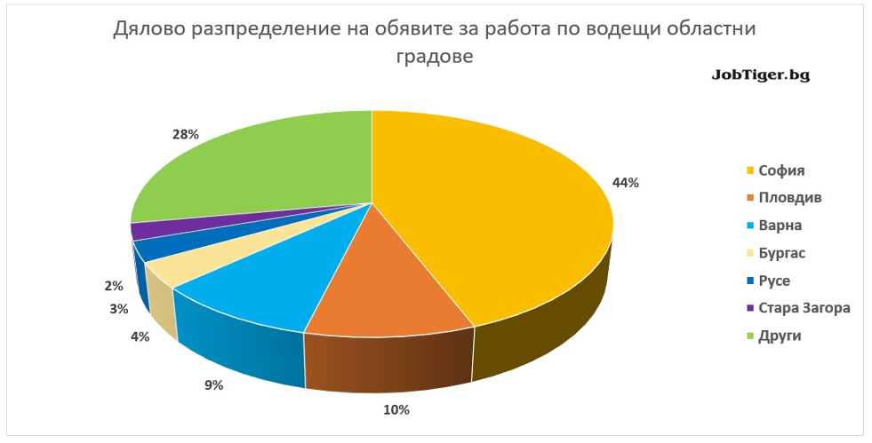 Според анализа на HR компанията и кариерен сайт JobTiger, във всеки от водещите областни градове се наблюдава двуцифрен спад на обявите. Общият им брой в тези градове е намалял с 18%, като спадът във всеки град е както следва: София (-17%), Пловдив (-20%), Варна (-21%), Бургас (-27%), Русе (-16%) и Стара Загора (-13%).